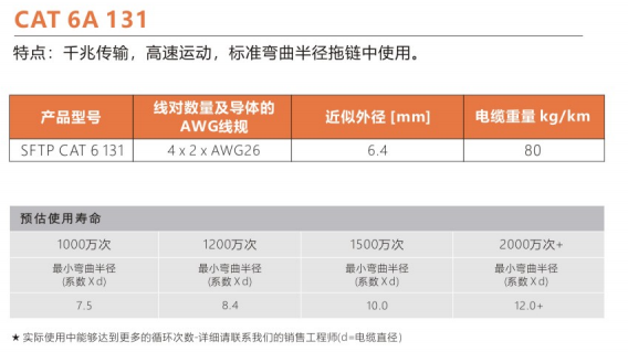彎曲半徑 : 非拖鏈內(nèi)運動:6.0X電纜外徑
